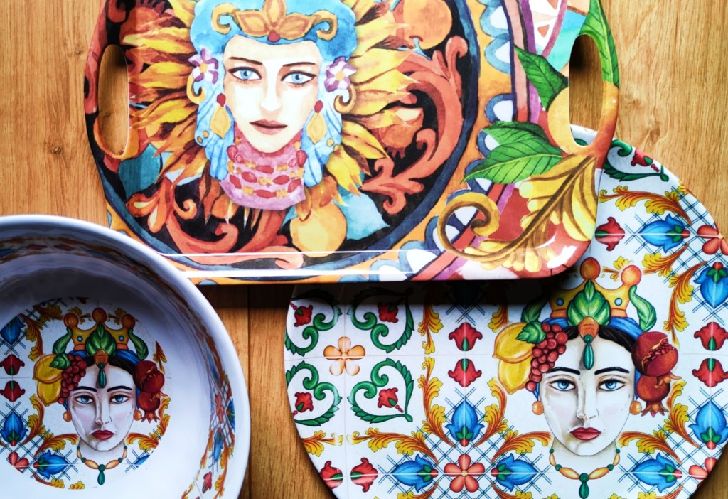 Która z legend jest prawdziwa? Tego już się nie dowiemy, tymczasem ceramiczne głowy stały się jednym z symboli Sycylii, a lokalni artyści (prym wiodą ci z miasta Caltagirone) prześcigają się w coraz to bardziej wymyślnych kreacjach. Teste di Moro stały się również dekoracyjnym motywem przewodnim – ozdabiają ręcznie malowane torby, pojawiają się w miniaturowej formie lub po prostu jako niewielkie, choć urocze magnesiki. Zdobią dekoracyjne naczynia, stanowią lubiany element biżuterii, bądź… inspirują słynnych projektantów, o czym już niedługo…